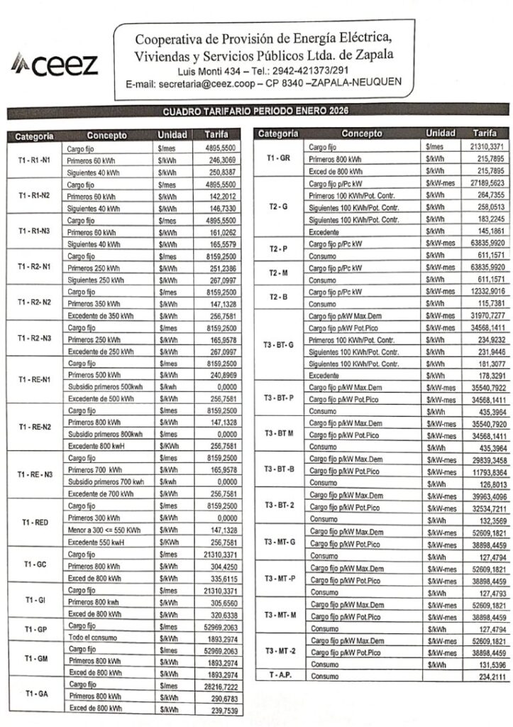 La CEEZ dio a conocer el Cuadro Tarifario correspondiente al período enero 2026 COMPARTIR Facebook Twitter Related Articles «2da NOCHE DEL CORSO DE ZAPALA» febrero 22, 2026 Zapala ofrece descuentos de hasta el 20% para el pago de tributos municipales enero 22, 2026 Matías Hermosilla y una noche soñada: representará a Zapala en el Festival Nacional de Folklore de Cosquín enero 22, 2026